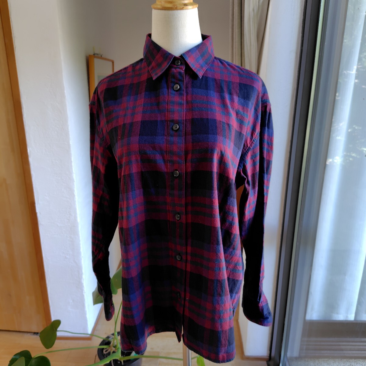 - UNIQLO コットン100% シャツカラー 長袖ブラウス ドロップショルダー 長め 丈 M チェック可愛い ハオリにも☆