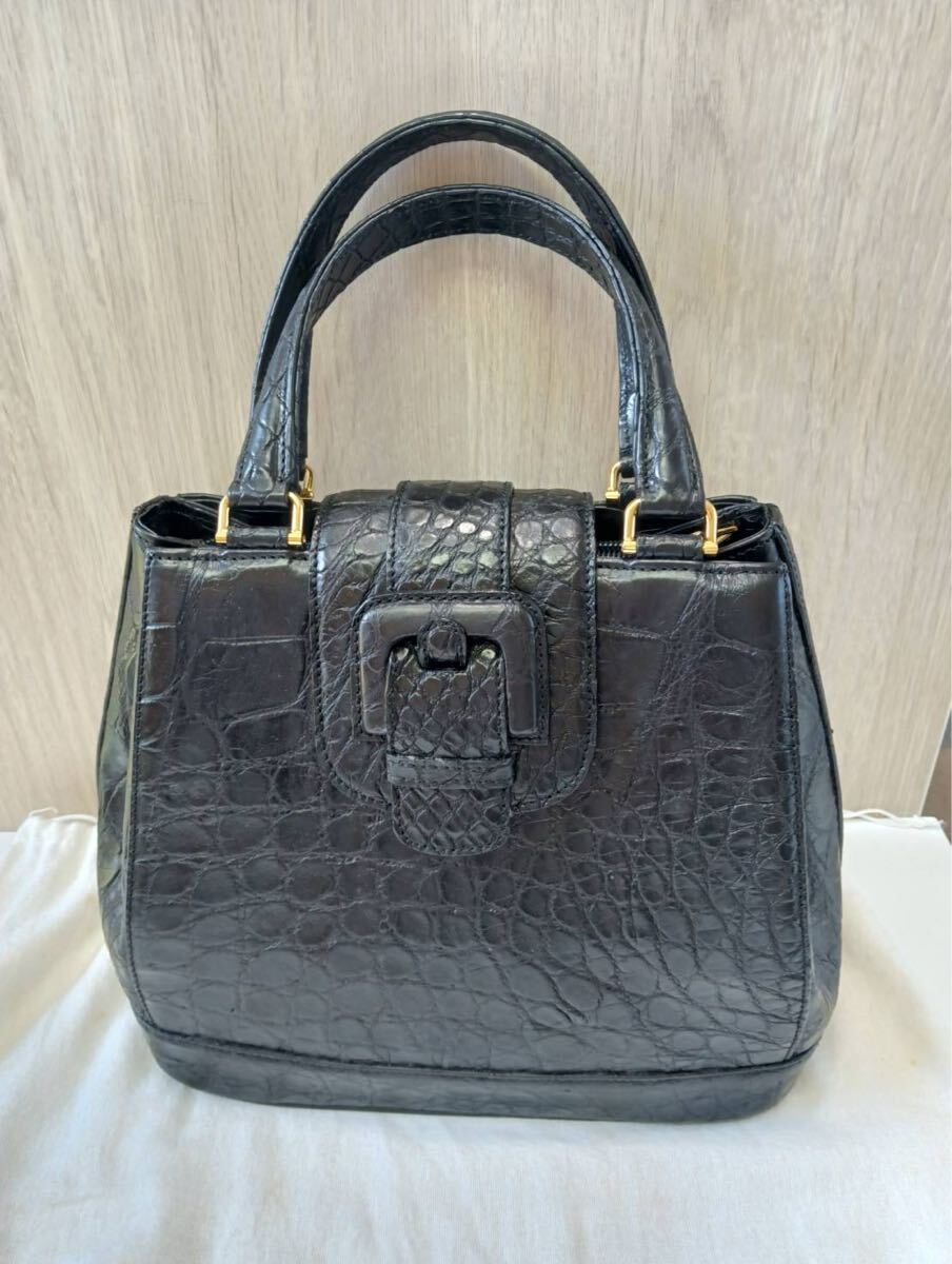 - 【中古品】KRISTAR CROCO クロコ 2WAY ハンドバッグ ショルダーバッグ 黒ブラック 肩掛け 手提げ バッグかばん 保存袋付き 現状品