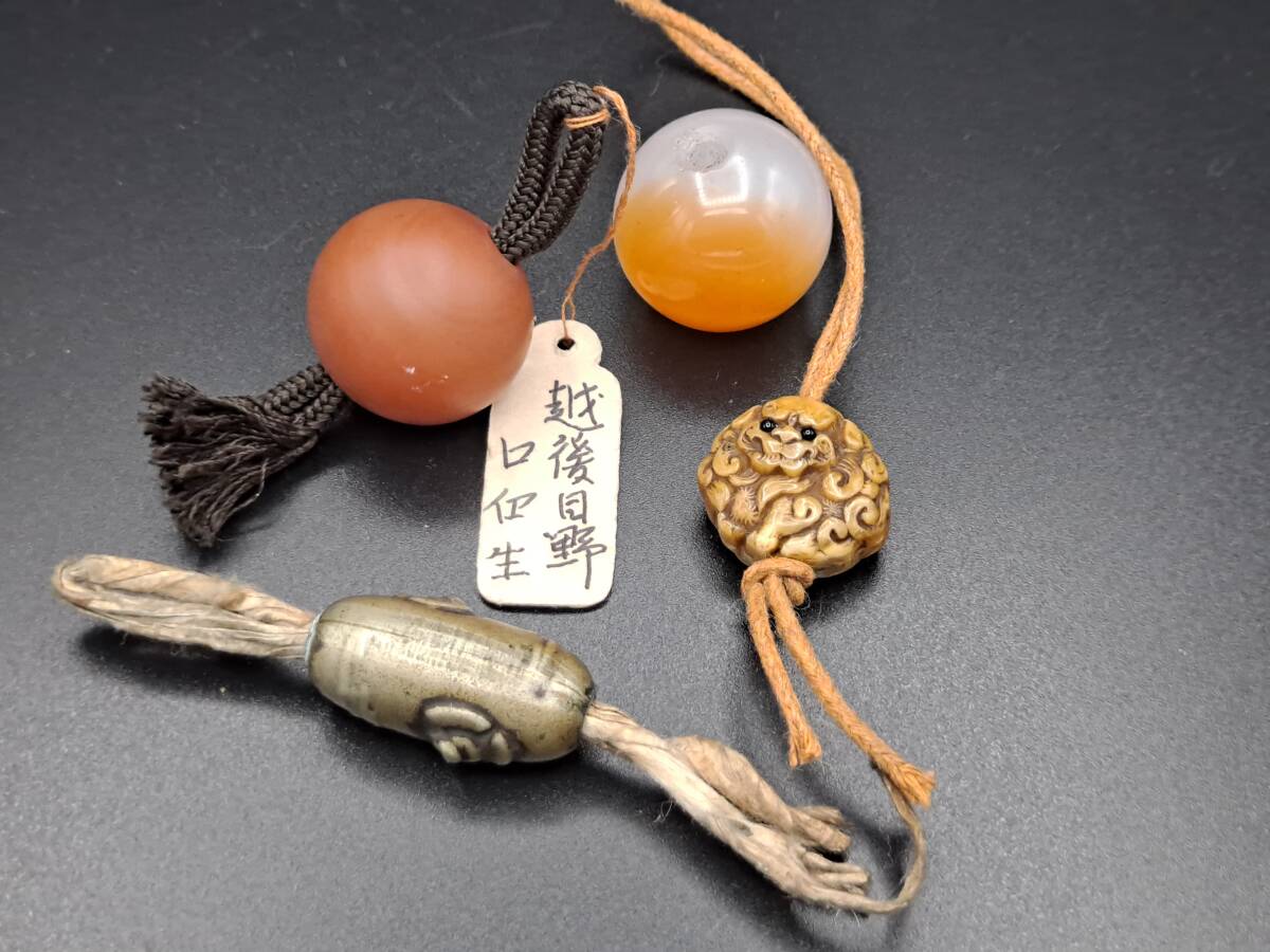 - 【7】19世紀~20世紀お締め玉4点「獅子」「福良雀」「越後日野ロリ玉」「日ノ丸瑪瑙」金工他20世