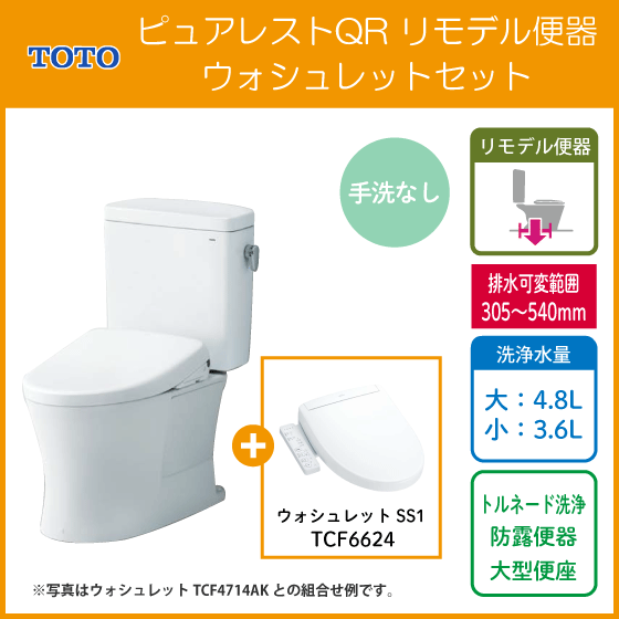 > 便器 ピュアレストQR リモデルタイプ(手洗なし) ウォシュレットSS1セット CS232BM,SH232BA,TCF6624 TOTO リフォーム用便器