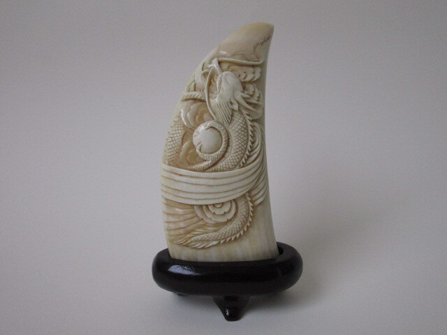 > マッコウクジラ 鯨歯 歯 牙 龍 細密彫刻 台座付 置物 重量 約 231g 検/ 中国古玩 クジラ歯 根付 印材 飾り物 古美術