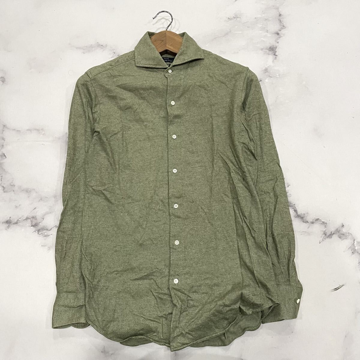 > A ○ 都会のカジュアルウェア '日本製' SHIPS シップス FINE FIT 長袖 コットン100% ボタンシャツ M メンズ トップス 古着 グリーン