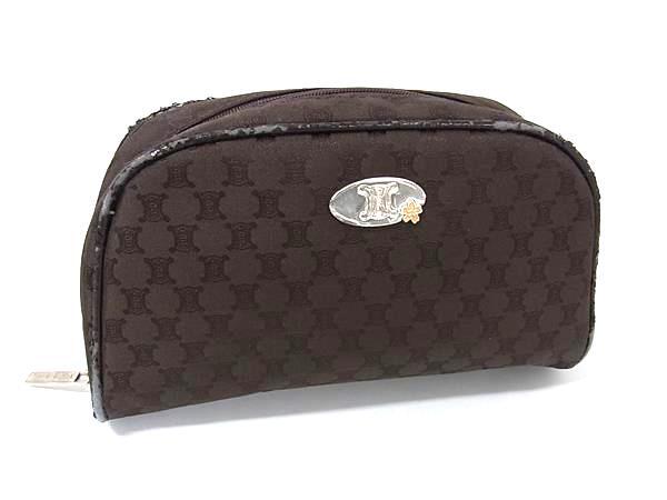 - CELINE セリーヌ マカダム柄 ナイロン×レザー メイクポーチ 化粧ポーチ マルチポーチ マルチケース 小物入れ ブラウン系 DJ1118