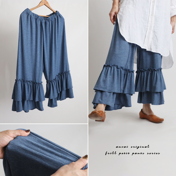 - 秋の新作 85cm スムース伸縮ストレッチ 大花フリル裾パンツ ペチ インナー 冷えとり保温 重ね着 サックスシャンブレーK34B