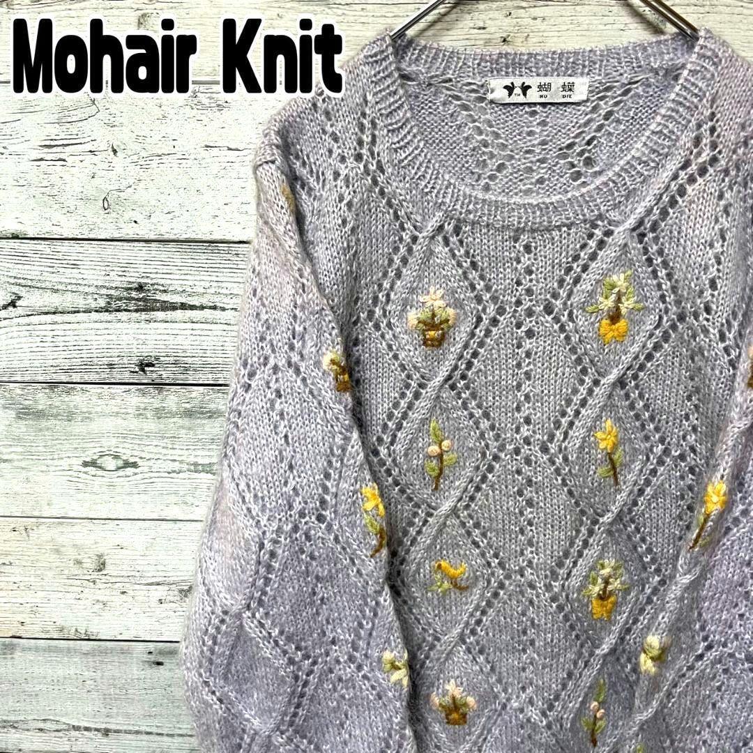 - モヘアニットプルオーバー 花柄刺繍 ハンドメイド 透かし編み ケーブル編み