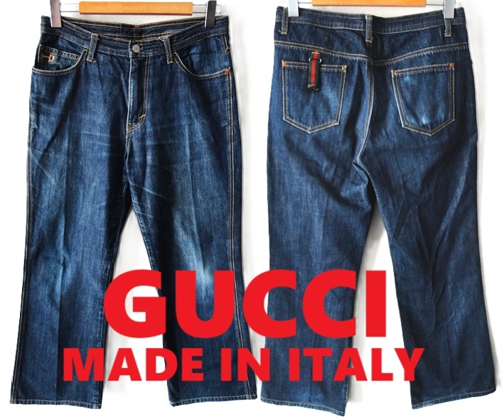> イタリア製/GUCCI:グッチ/ホースビット刺繍&ウェブストライプ ストラップ ワイド ブーツカット デニム パンツ/インディゴ/size46/ジーンズ