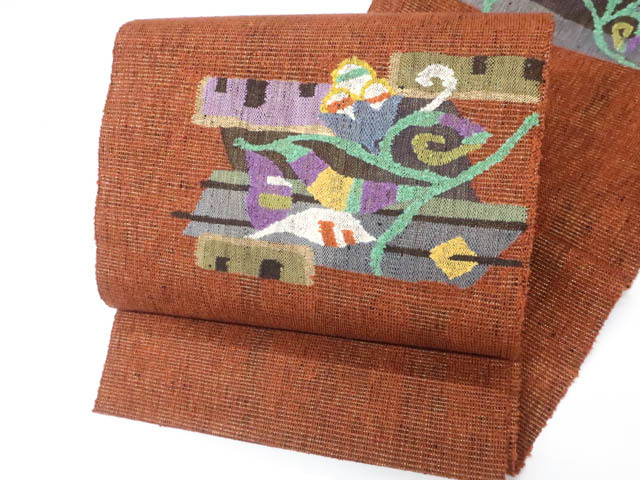 - 《古美術京松》【着物】八寸名古屋帯 太鼓柄 金糸 開き仕立て 紬織 植物文 kyo7b06-124