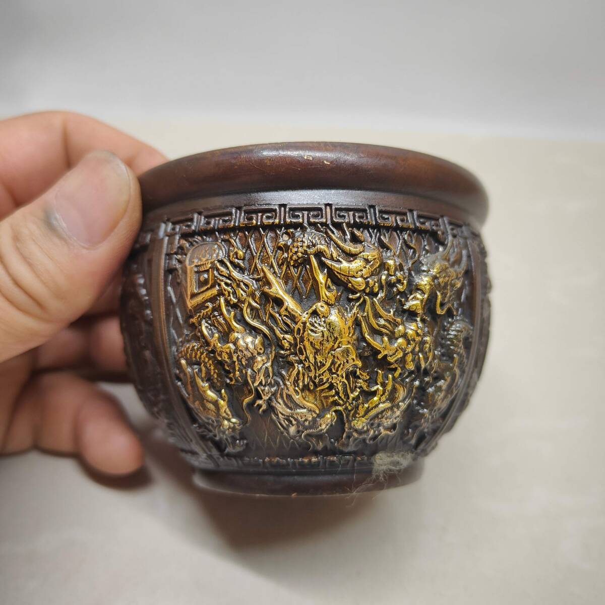 - 『館蔵珍品 紫銅製 塗金 小九龍缸 置物 賞物』稀少珍蔵品 古賞物 貴重物品 収蔵品 中国古美術 時代物 古董品