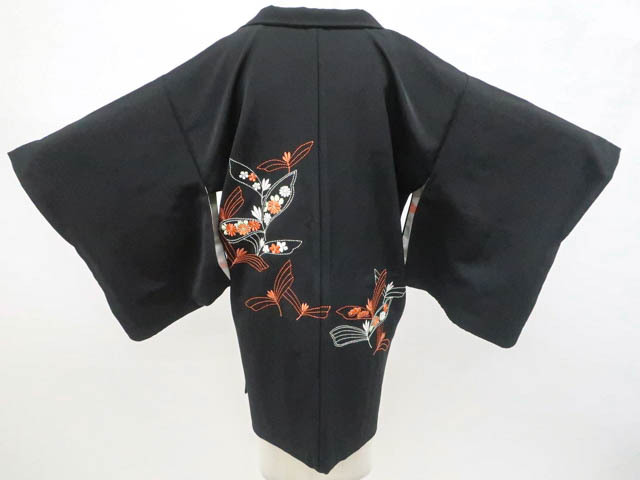 > 《古美術京松》リサイクル着物 羽織 黒羽織 昭和レトロ 刺繍 花 金糸 羽織紐付 正絹 身丈約84cm 裄丈約63.5cm kyo7z10-1167