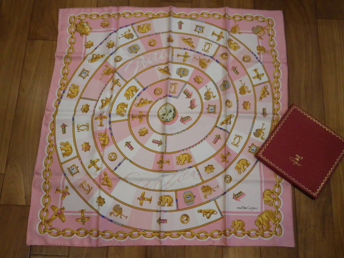 - 未使用箱入り カルティエ アクセサリー柄スカーフ ピンク タンク サントス シルク100%