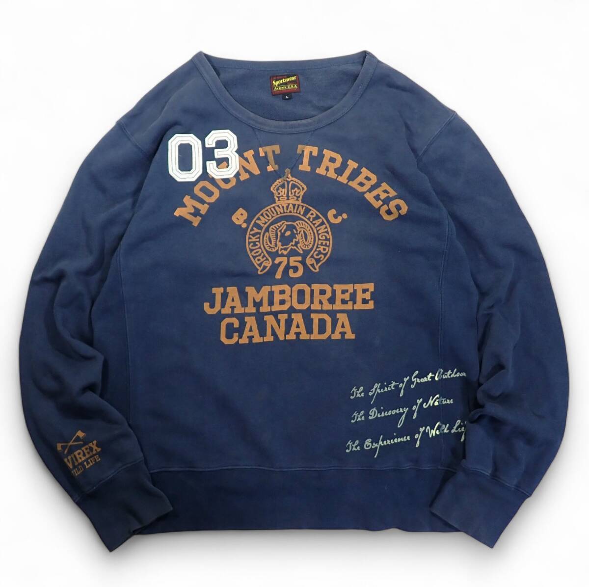 > 7107/Avirex U.S.A スウェット トレーナーL●くすみネイビー プリント ワッペンROCKEY MOUNTAIN RANGERS AVIREX上野商会●洗濯プレス済古着