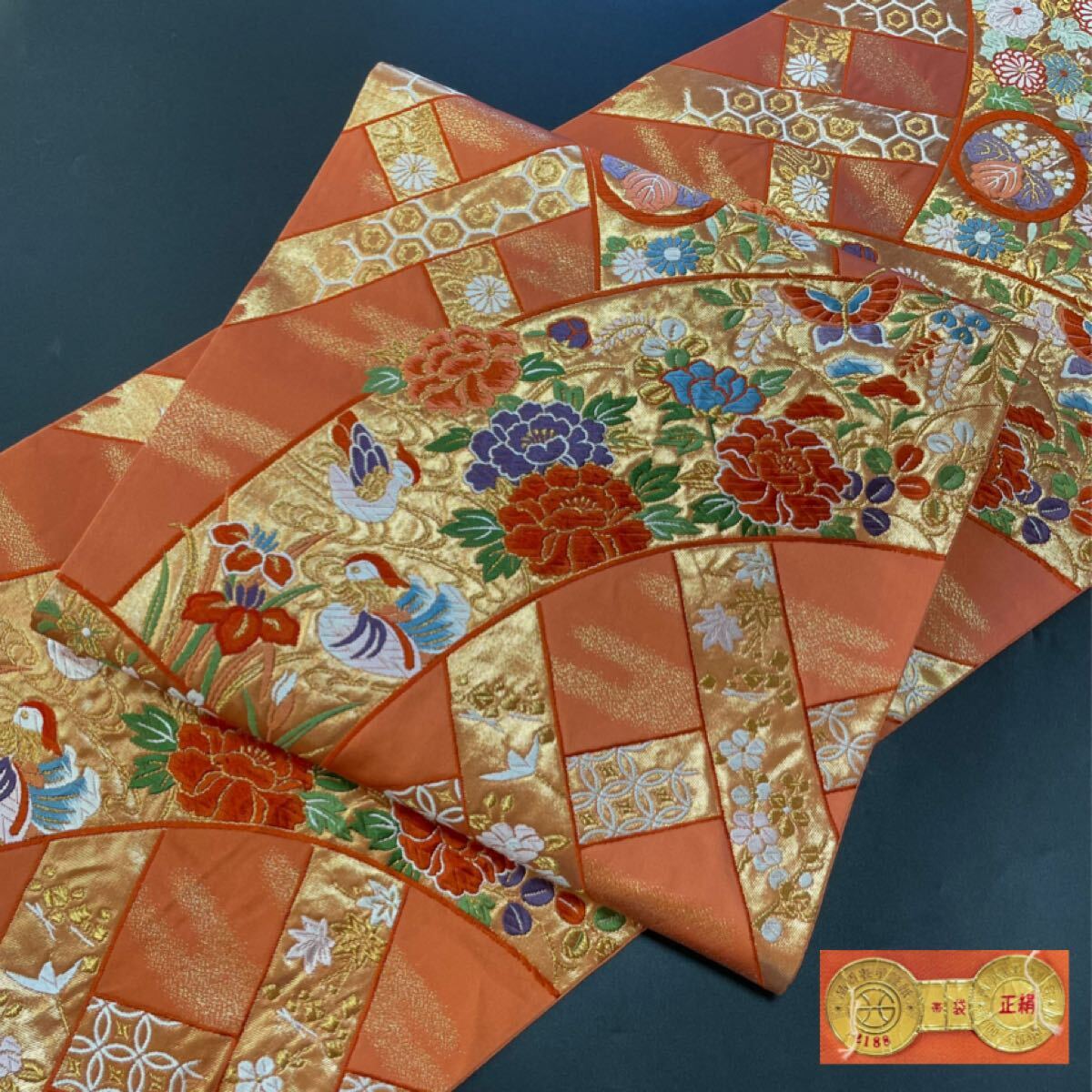 > #G189 美品 袋帯 六通 未仕立て 西陣織 華光悦垣 引箔 金糸 メガネ証紙 2188 鴛鴦 牡丹 正絹 和装 和服 フォーマル帯【wellriver】