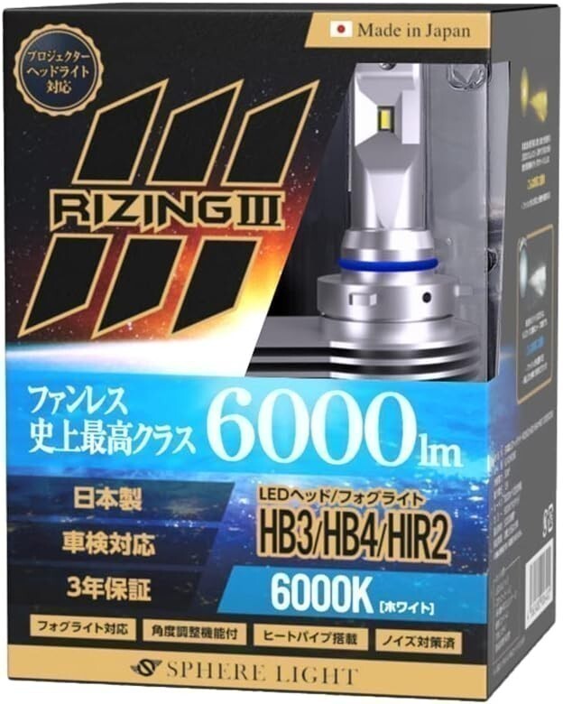 > 3年保証 スフィアライト ライジング3 RIZING3 HB3/HB4 12V用 6000K ファンレス 日本製 LED ヘッドライト 6000lm 車検対応 SLRZHB060