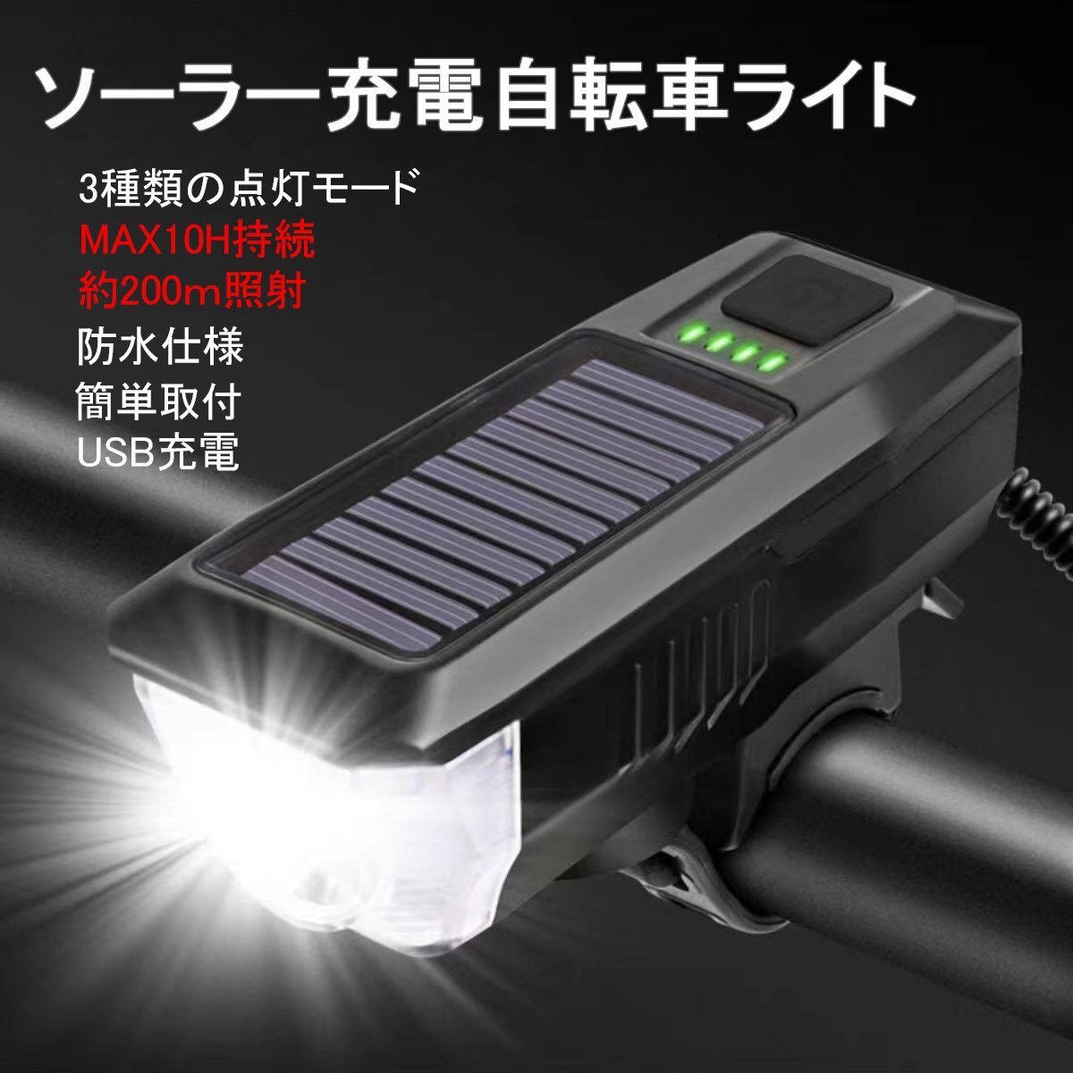 - 自転車ライト バイクライト ホーン付き USB充電+ソーラー充電式 LEDライト残量表示 自転車ヘッドライト 自転車電子ホーン