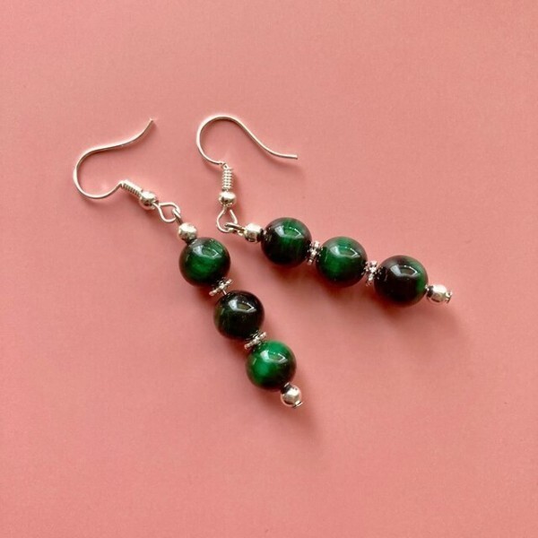> グリーンタイガーアイ ピアス フックピアス 8mm (シルバー) イヤリング、樹脂フック変更可 樹脂ピアス シンプル ハンドメイド