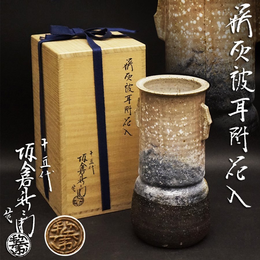 > 十五代坂倉新兵衛作 萩灰被耳附花入 萩焼 花瓶 茶道具 煎茶道具 時代 骨董 花器 壺 花瓶 未使用品 共箱 古美術品