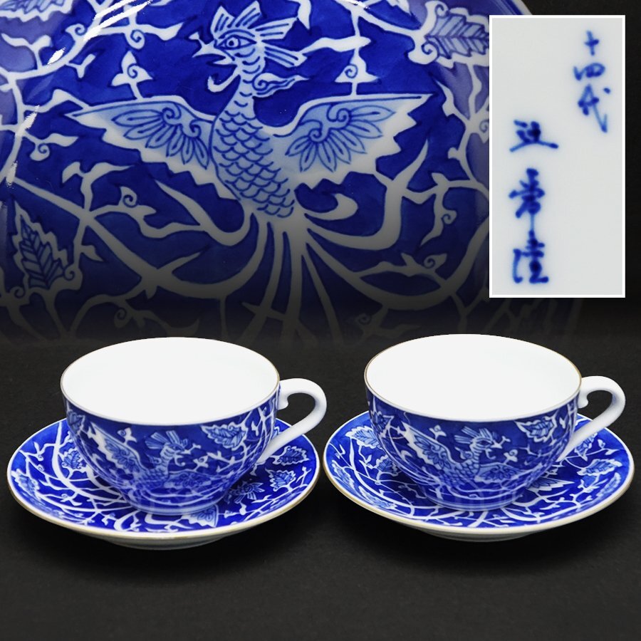 - 十四代 辻常陸 カップ&ソーサー2客 染裏御用窯元 宮内庁御用達 有田焼 煎茶道具 茶道具 時代 骨董 共箱 無傷 極美品 古美術品