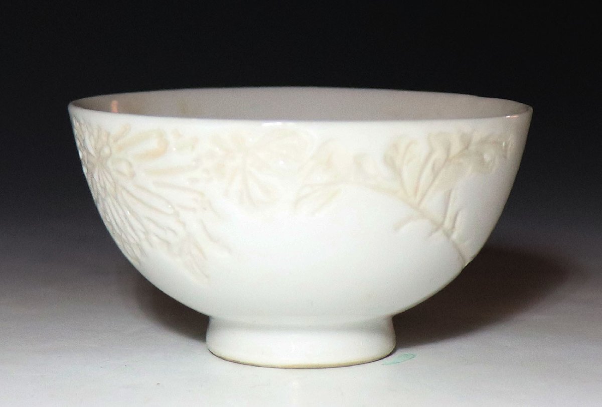 - 【桃】酒器ぐい呑み:清朝民国期徳化窯白磁印刻菊花紋様猪口