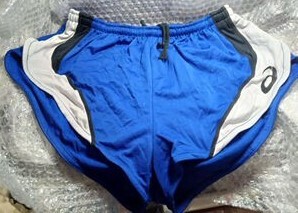 > asics製、メンズ、ランパン、青地両脇黒白切り返し入り、インナーパンツ無し、ポリエステル100%、M~Lサイズ、