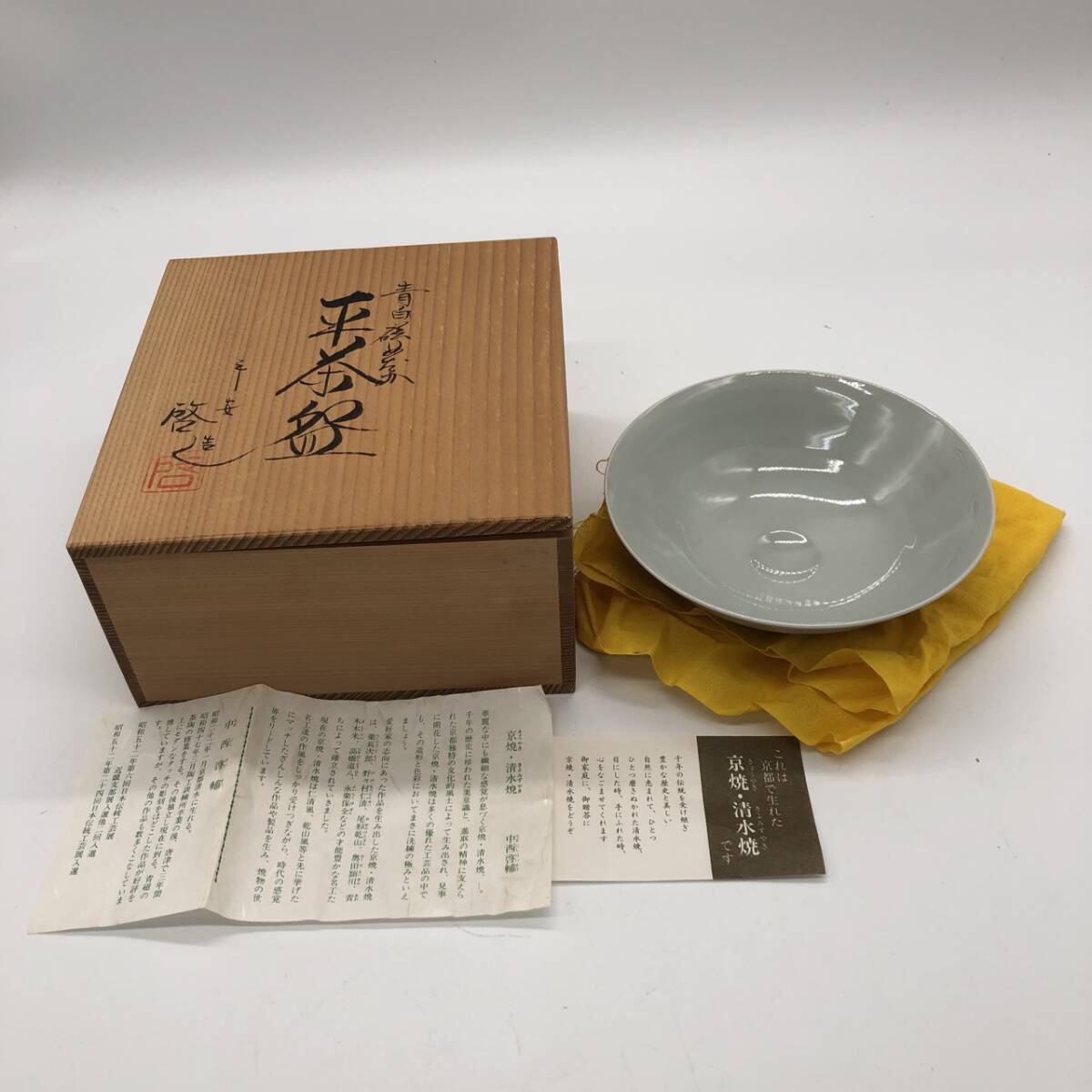 - tk2051-11 京焼 清水焼 中西啓輔 青白磁 めだか 平茶碗 共箱