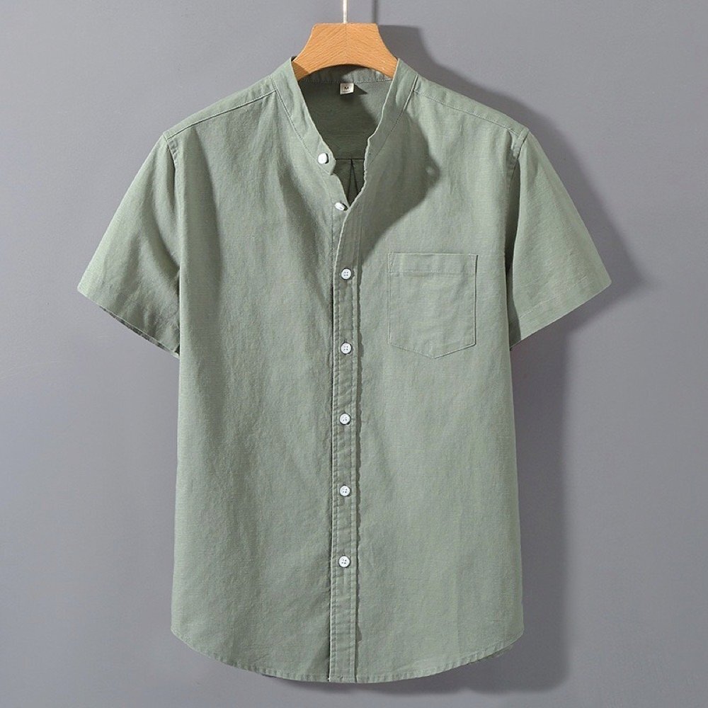 > シャツ 半袖 メンズ リネン トップス カジュアルシャツ 開襟シャツ 麻綿 スタンドカラーシャツ ファッション サマーシャツ グリーン 2XL