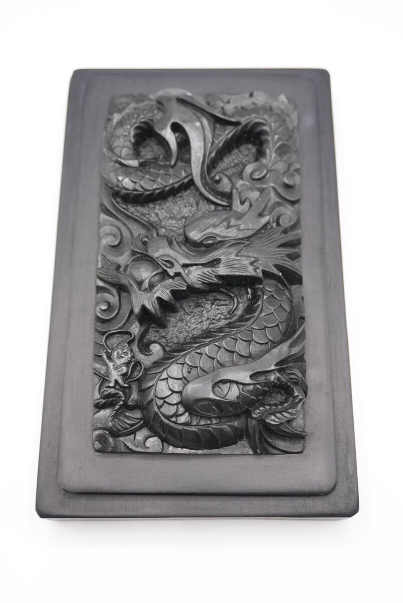 - 書道具 硯 中国美術 蓋付 龍 彫刻 未使用