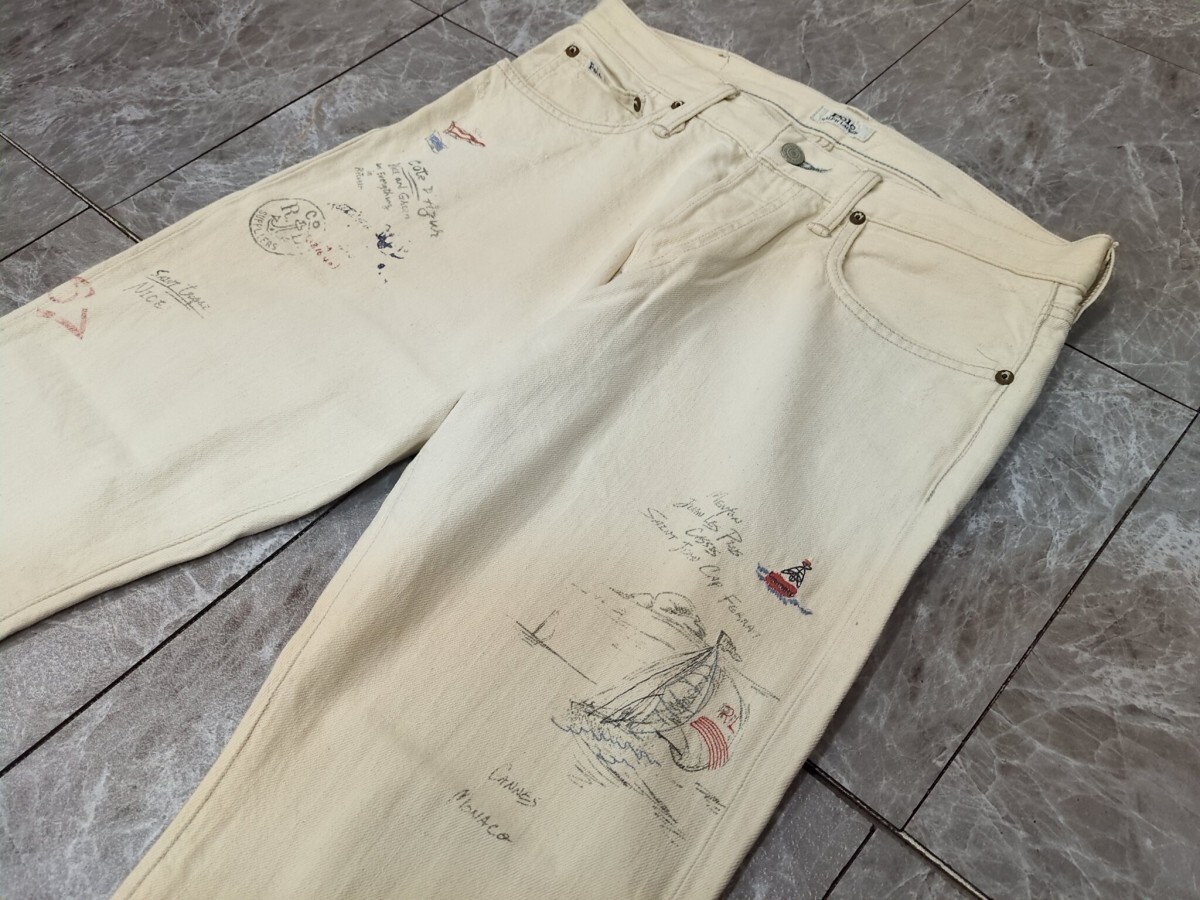> 5. POLO RALPH LAUREN 刺&プリントハンドペイント 生成りジーンズ ホワイトデニム SYLLIVAN SLIM メキシコ製 デザイン 32/30 y407