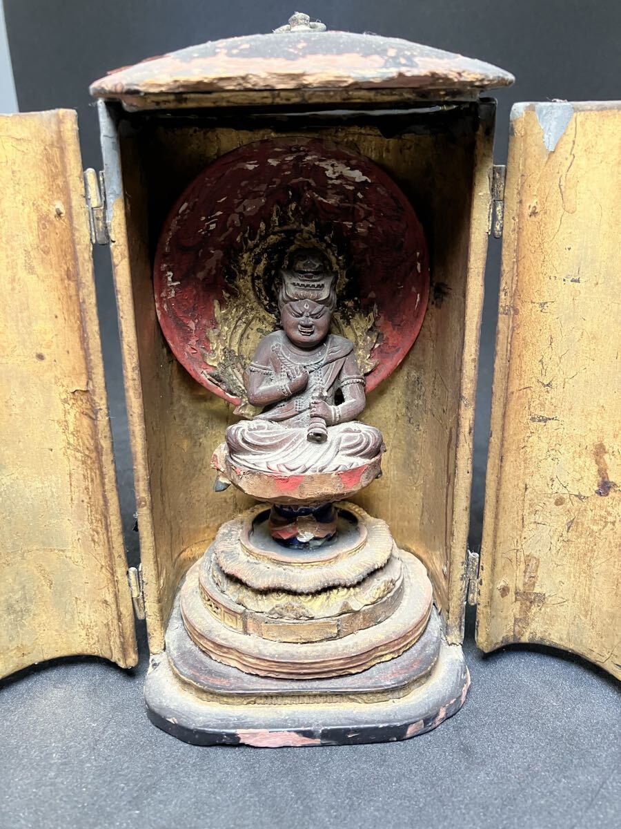 - 時代物【愛染明王】仏具 仏像 厨子入 仏教 密教 明王 護摩 加持祈祷 法衣 僧侶 袈裟 仏 佛 彩色 木彫 寺院 寺 仏具 置物 厨子 仏教美術