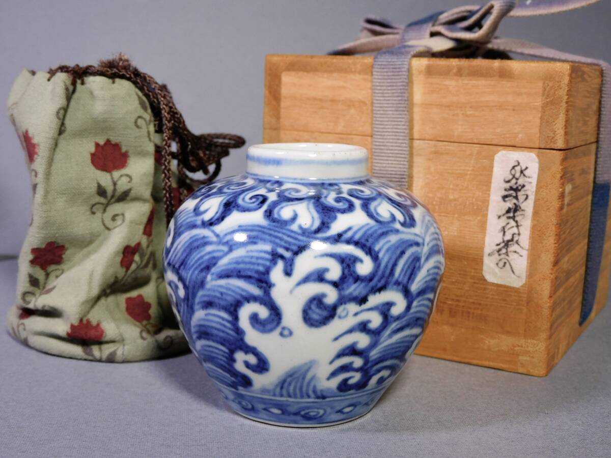 - 明時代 染付海水文茶入 仕覆 箱付 明 永楽 (九州蔵家依頼品⑥)