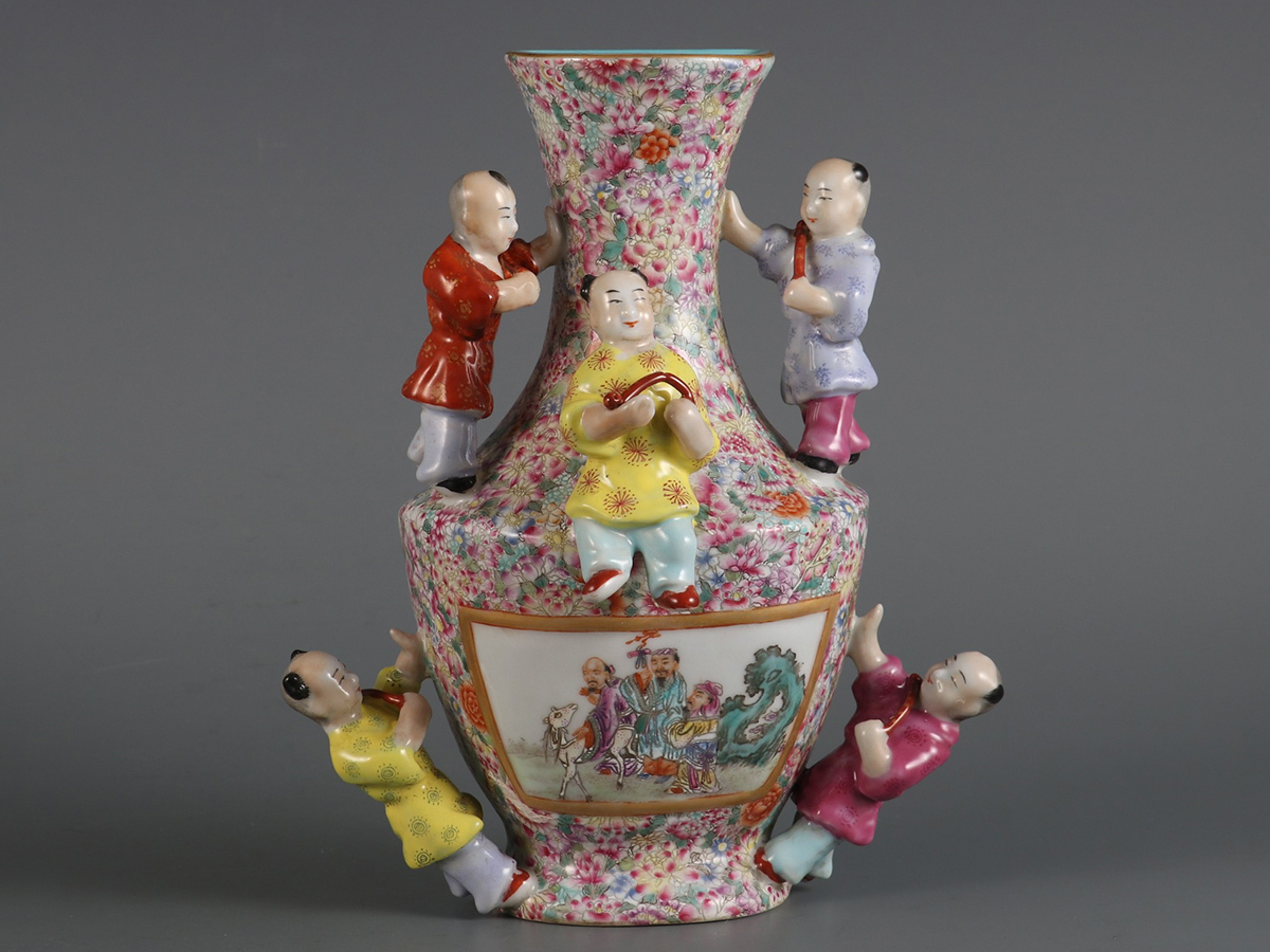 - ▽鴻▽清朝時代 陶磁器 乾隆年製 粉彩万花紋五子登科壁瓶 箱付き 染付 時代物 中国古美術 骨董品