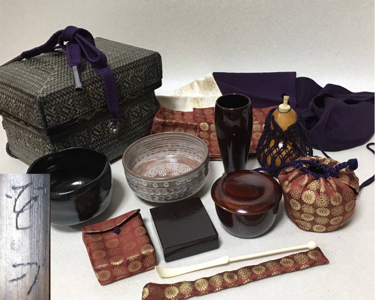 - E799 茶籠 御所籠 在銘 茶箱 茶碗 茶杓 茶筌筒 棗 香合 振出 古帛紗 仕覆