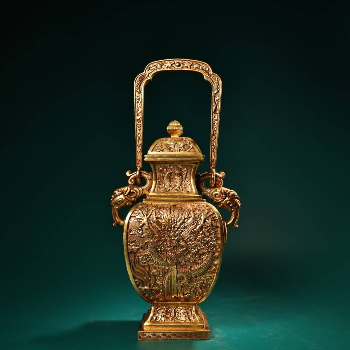 - ▽鴻▽ 紫銅製 塗金 浮雕 鏨刻 提梁花瓶 置物 賞物 古賞物 古董品 時代物 稀少珍品 中国古玩 中国古美術