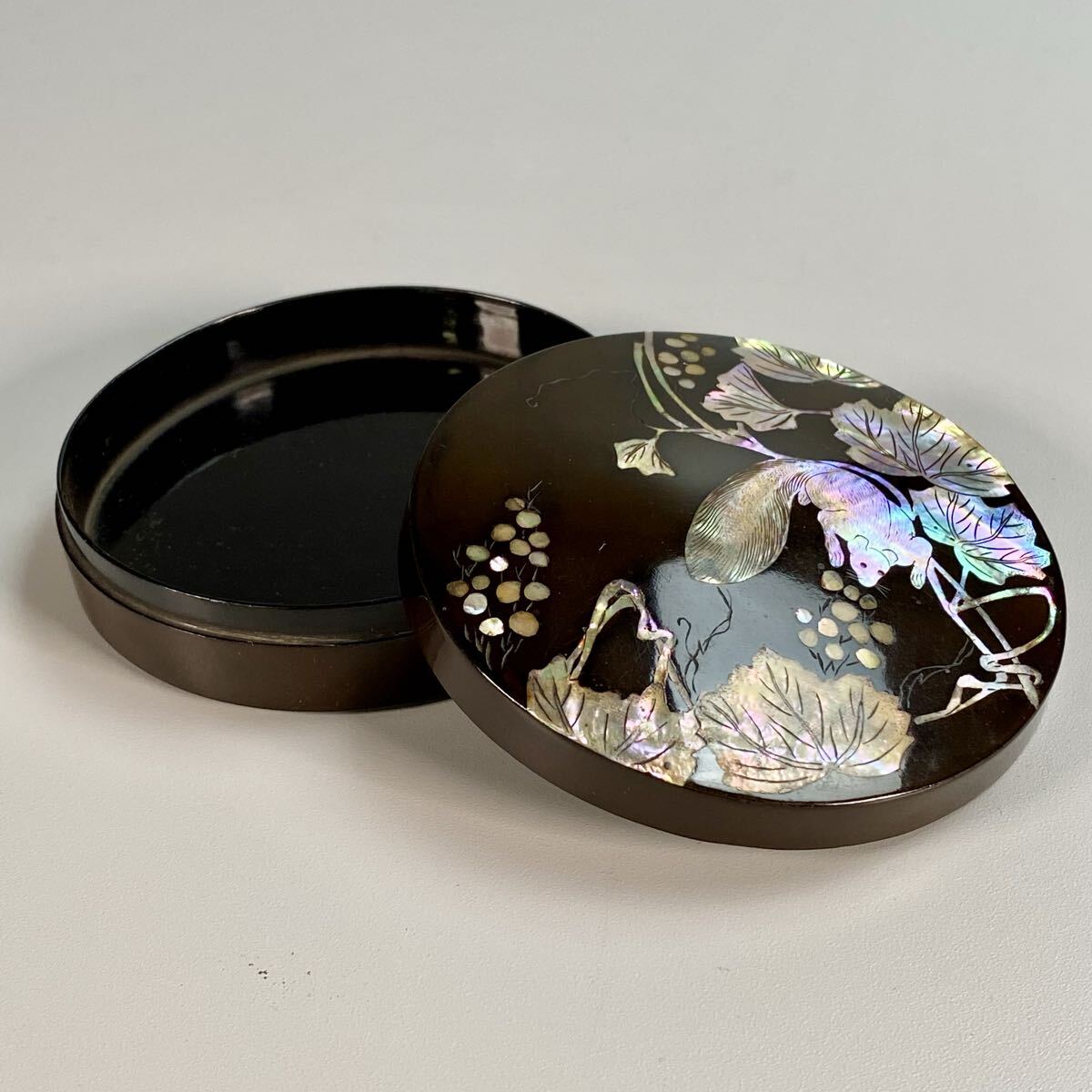 - 。猫夢◆ 十四代 而妙斎 花押 青貝蒲萄文丸香合 8cm 螺鈿 箱書 唐物 骨董 [K54]しち