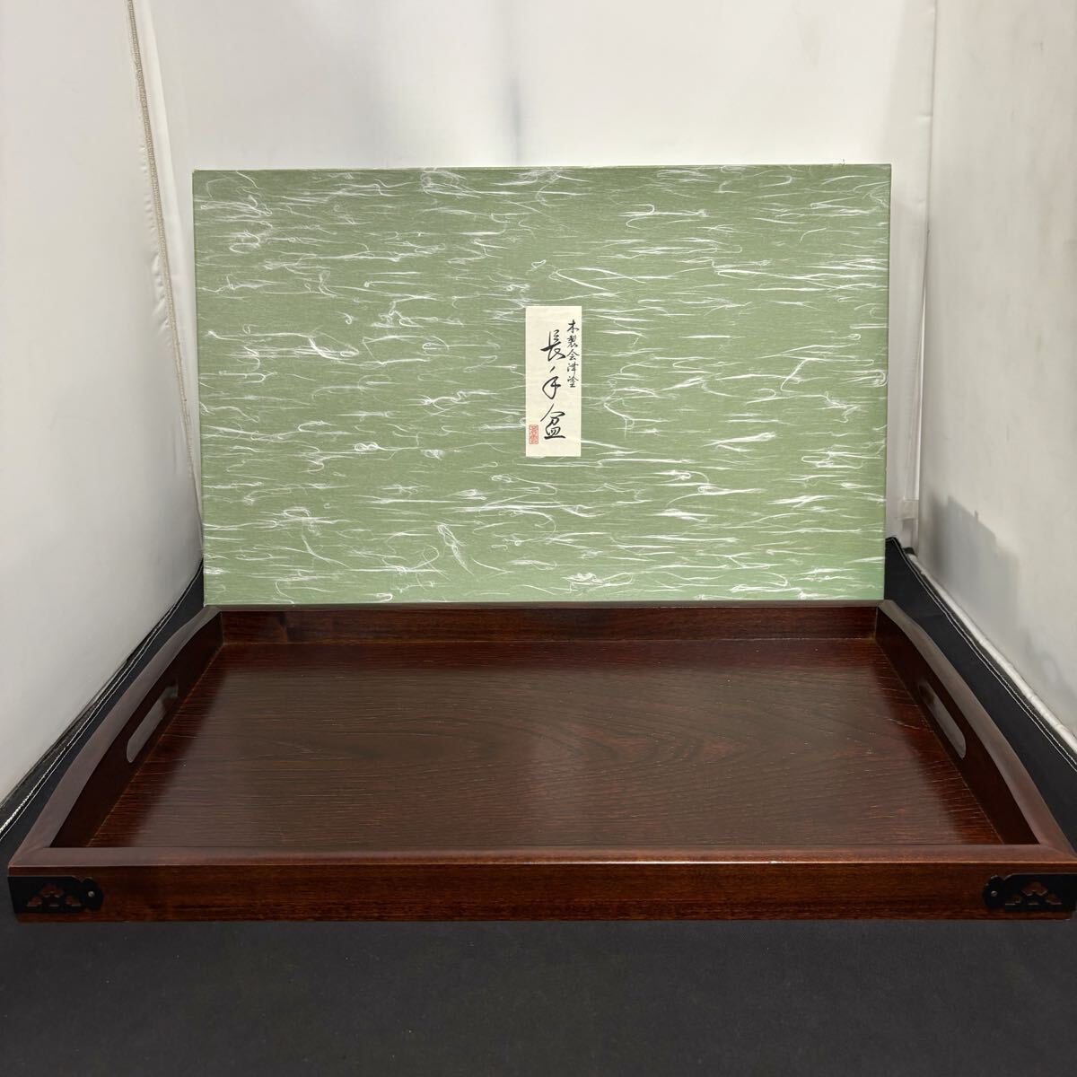 未使用 会津塗 蒼雲 尺8寸 脇取盆 長手盆 金具付 木製 角盆 お盆 漆器 配膳 美品 (10147E