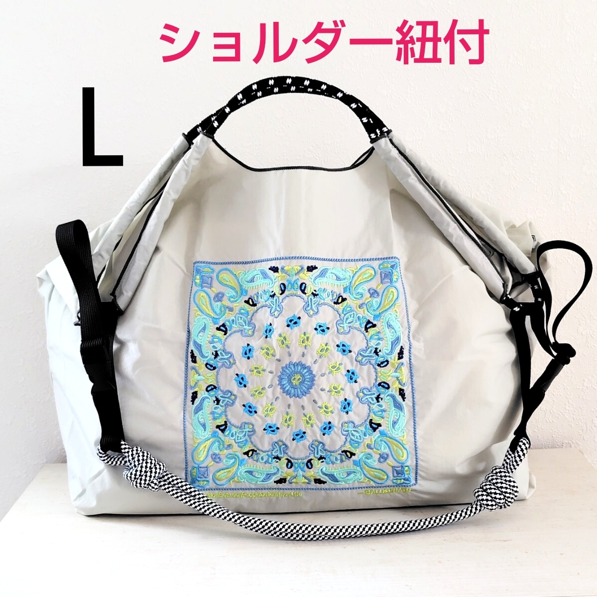 - L ペイズリー グレー 刺繍 エコバッグ ストラップ付き トートバッグ ブルー トートバッグ ショルダーベルト付