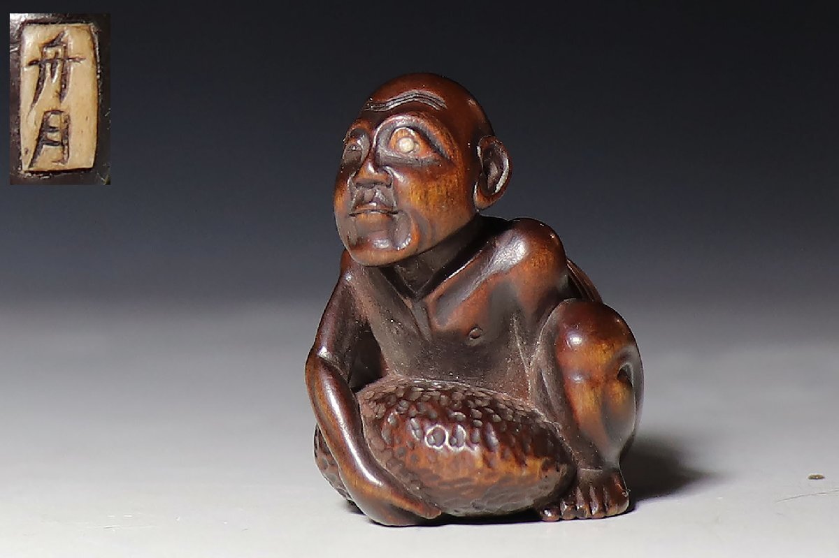 - 【桃】提げ物:木彫根付大金持ち 舟月