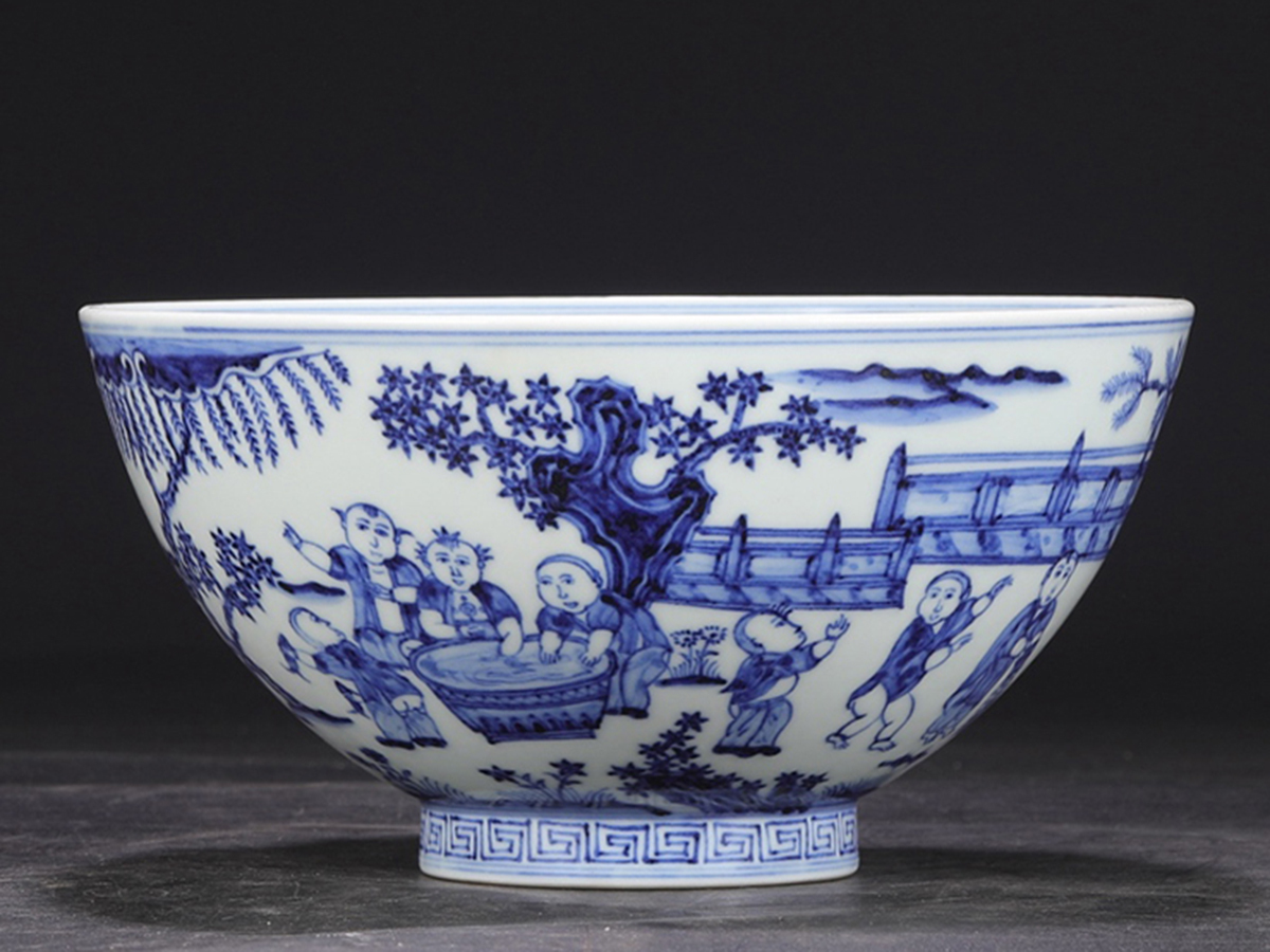 - ▽鴻▽明時代 陶磁器 大明宣徳年製 青花嬰戯図深腹碗 箱付 時代物 中国古美術 骨董品