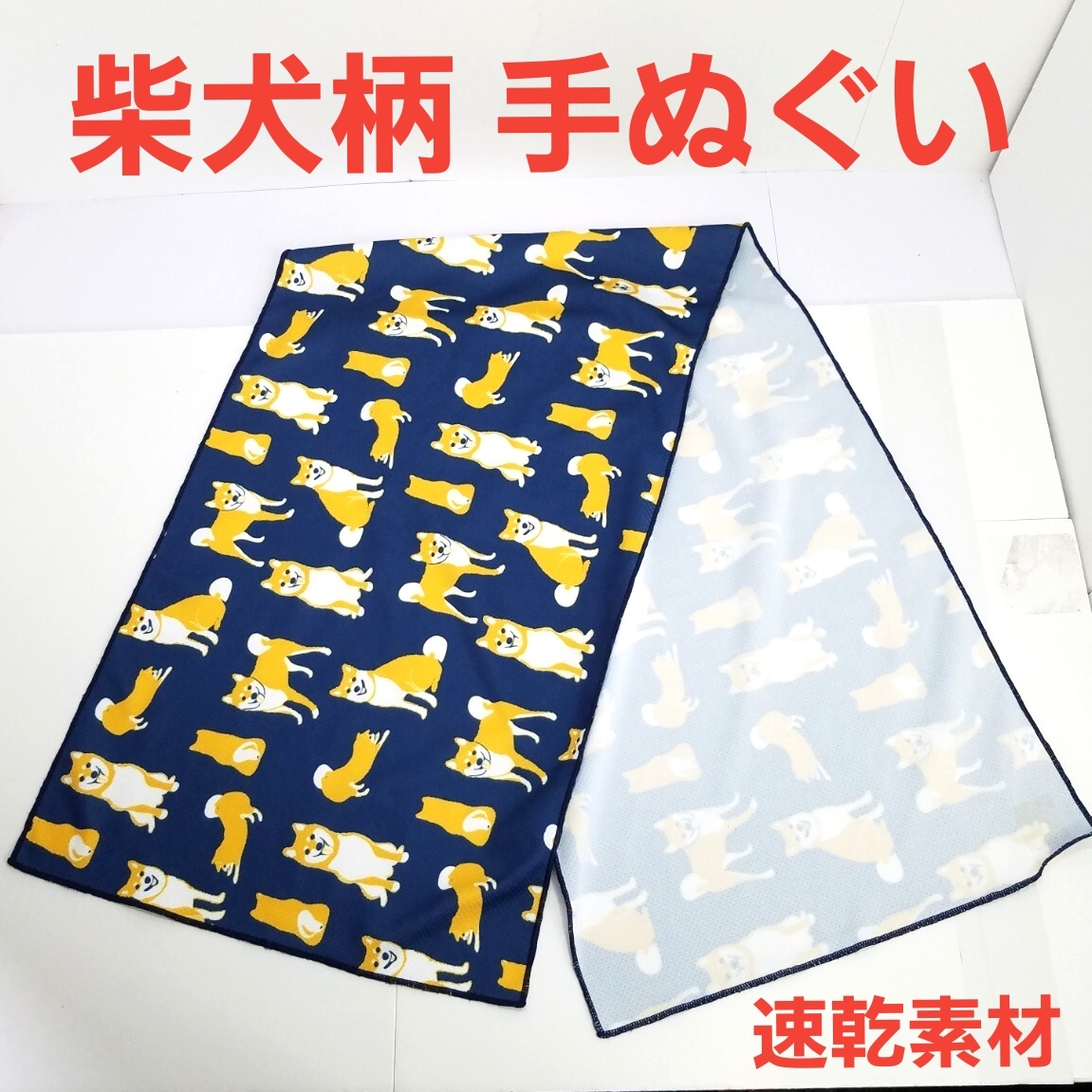 - 柴犬 速乾素材 ポリエステル 手ぬぐい タオル 濱文様 横浜捺染 青 雑貨 豆しば 豆柴
