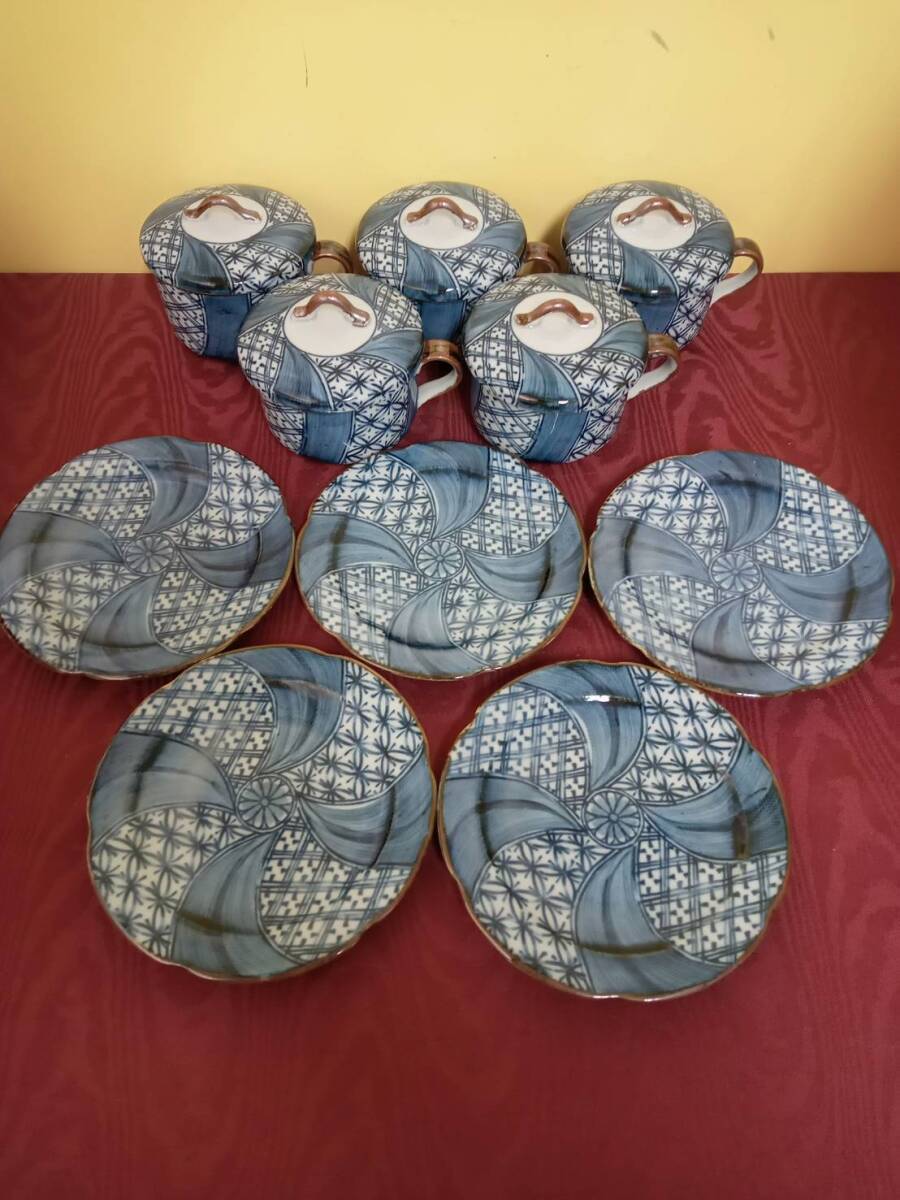 - 【愛陶 古染祥瑞 フタ付カップ 小皿 5客組】陶器 レトロ 和食器 茶器【A1-1】1015