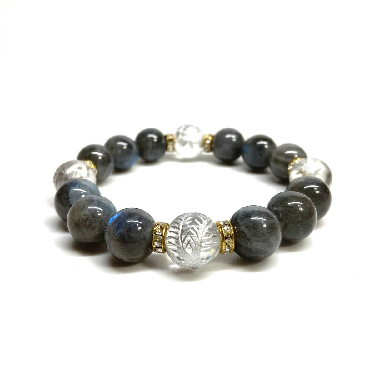 - 四神獣銀彫水晶×ラブラドライト 12mm パワーストーン ブレスレット天然石 青龍 白虎 玄武 朱雀 運気上昇 金運 お守り 四神獸 四神相応 G