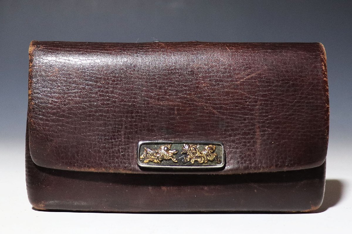 - 【桃】提げ物:金工銅地鍍金双麒麟銀縁金具革煙草入れ