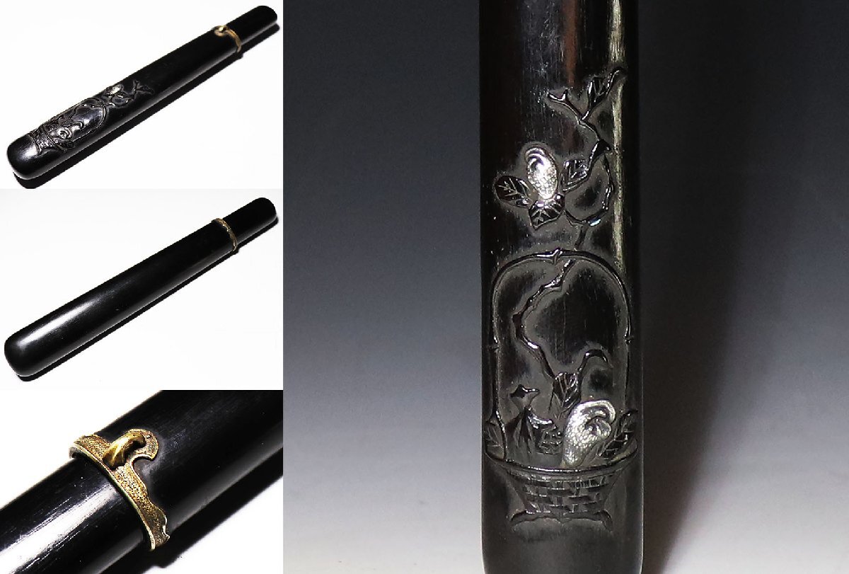 - 【桃】提げ物:唐木彫に銀蔵が仏手柑図銀縁煙管筒
