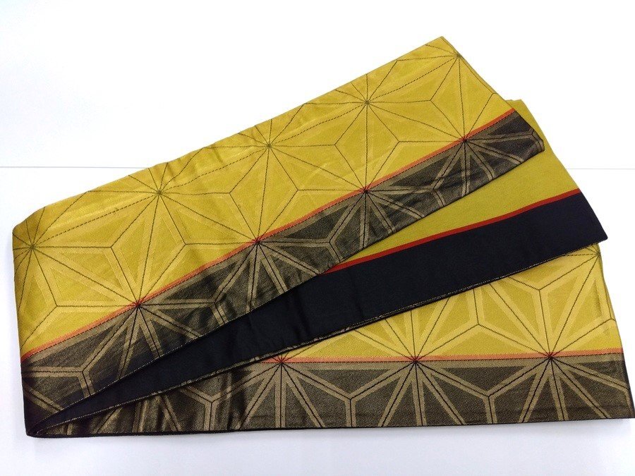 - 中古 リサイクル 仕立四寸帯 小袋帯 黄土色と焦げ茶色の麻の葉模様 裏地縞【舞踊教室】844 ggp