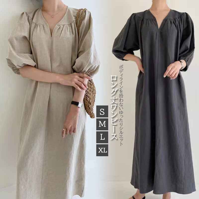 > レディース ワンピース ロング丈 マキシ Vネック 楽ちん ふんわり袖 きれいめ 体系カバー XL アプリコット