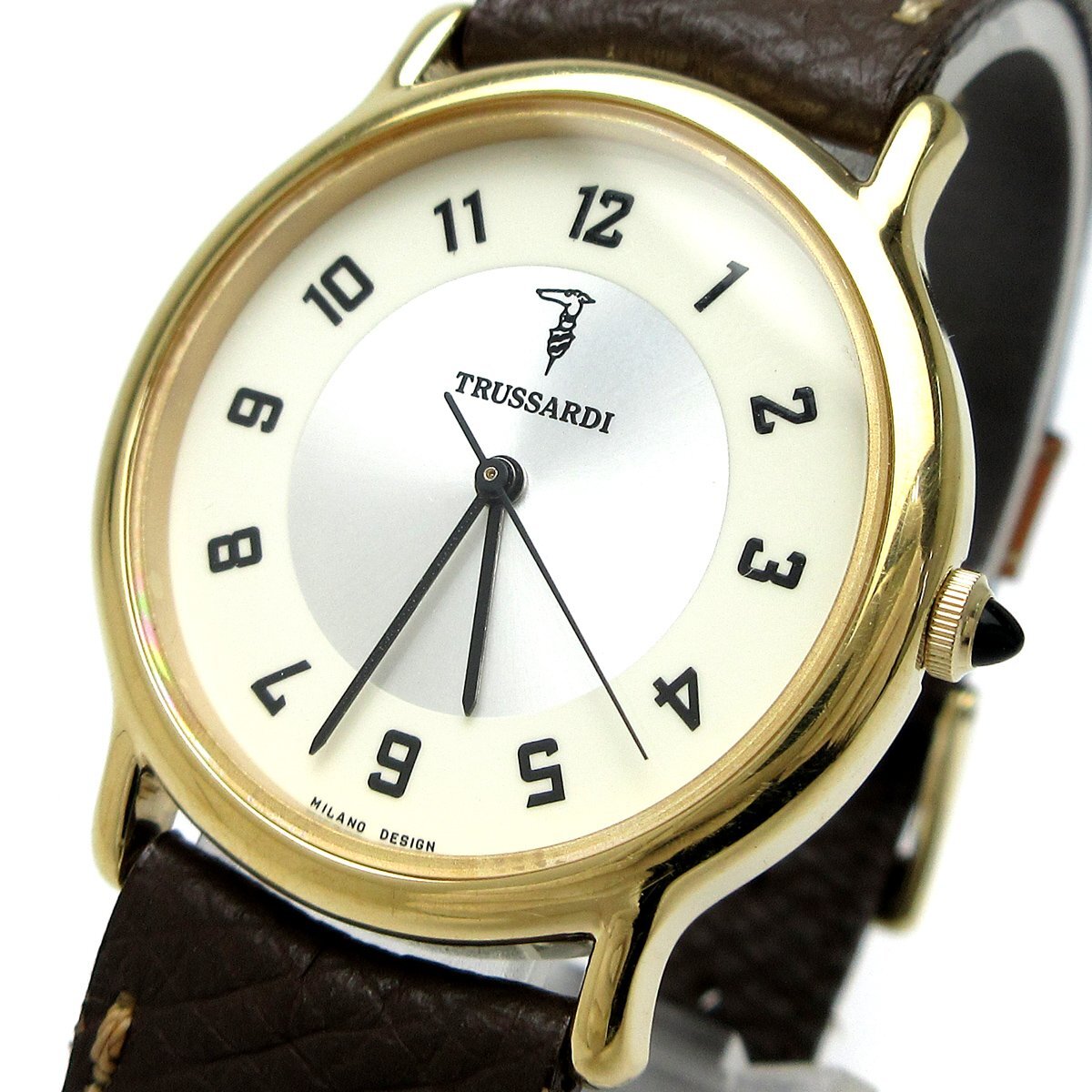 - トラサルディ ゴールドラウンド メンズ 革 白 シルバー TR2801 時計 TRUSSARDI クォーツ ヴィンテージ 稼動品