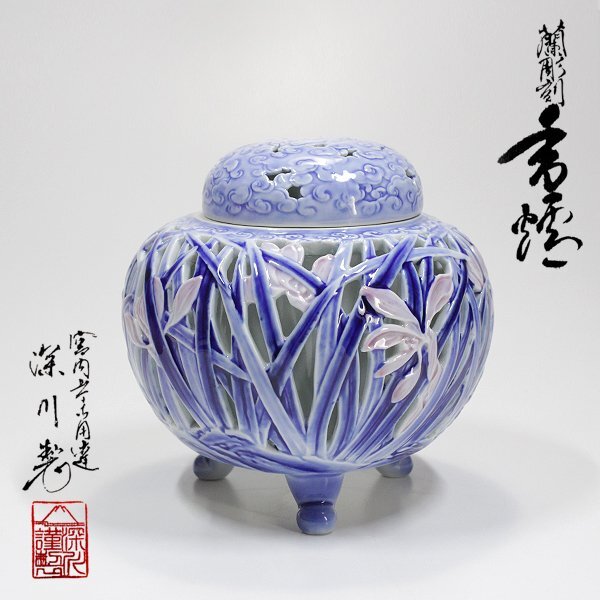 - 【TAKIYA】7973 深川製磁 『蘭彫刻香炉』 染付 透彫 宮内庁御用達 香蘭社 有田焼 古美術