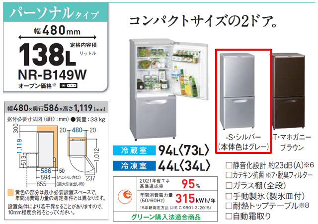 - パナソニック 2ドア冷蔵庫 NR-B149W-S 480x586x1119mm 138L(冷蔵94L/冷凍44L) 耐熱トップテーブル LED照明 ガラス棚 【長野発】