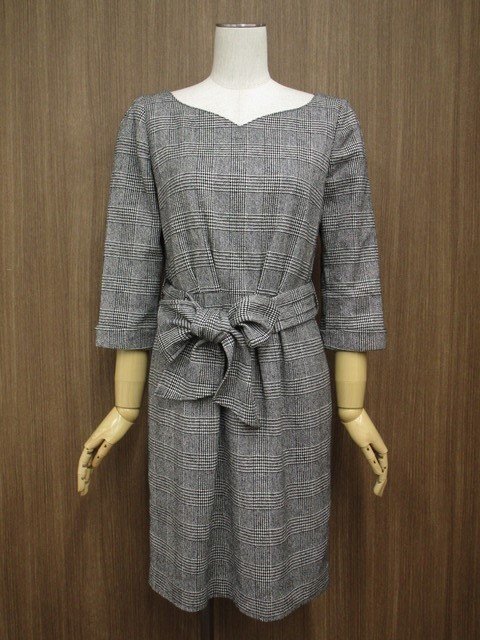 - 美品 アプワイザーリッシェ Apuweiser-riche ひざ丈 七分袖 ハートシェイプドネック ワンピース 2 ブラック×ホワイト グレンチェック柄