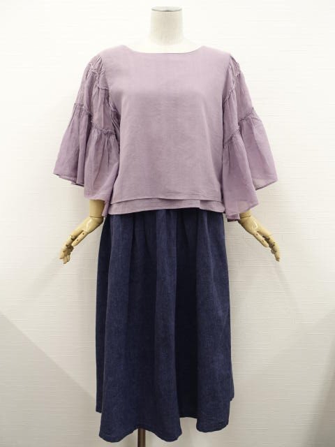 > 美品 KBF+等 七分袖カットソー+ロングギャザースカート コーデ2点セット M~L相当 パープル/ネイビー ガーリー・カジュアル系 20代~
