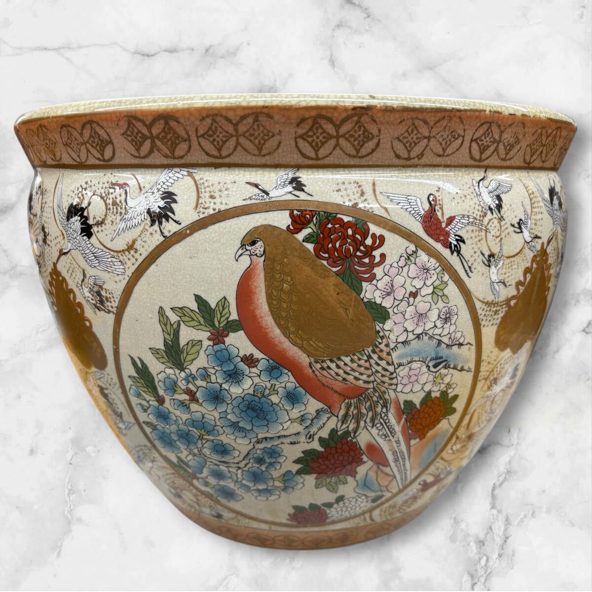- △a 薩摩焼 火鉢 金魚鉢 花鳥柄 風景 壺 陶器